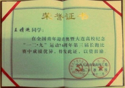 文法学院学生王婧滟在大连高校纪念“一二•九”运动76周年第三届冬季长跑比赛中取得优秀成绩