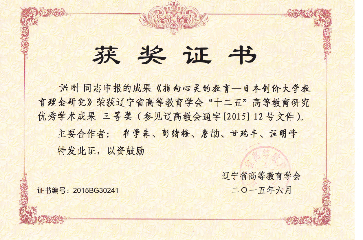 洪刚同志申报的成果《指向心灵的教育——日本创价大学教育理念研究》荣获辽宁省高等教育学会“十二五”高等教育研究优秀学术成果三等奖(参加辽高教会通字[2015]12号文件)。