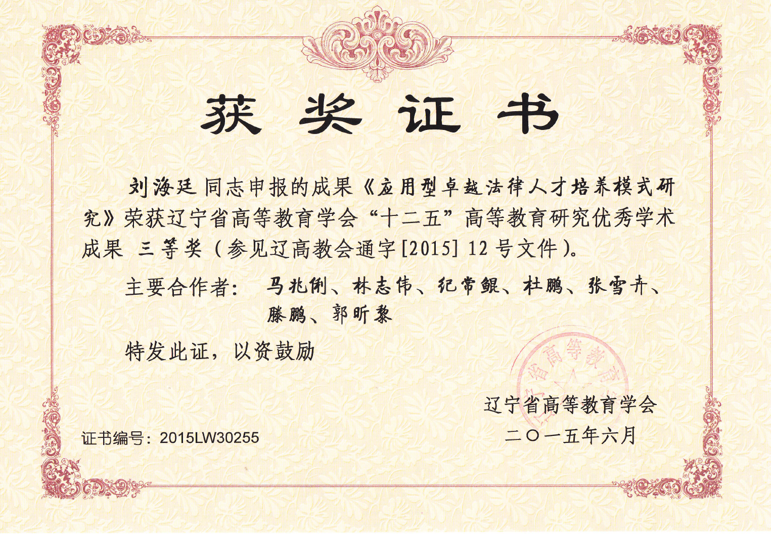 刘海廷同志申报的成果《应用型卓越法律人才培养模式研究》荣获辽宁省高等教育学会“十二五”高等教育研究优秀学术成果三等奖(参加辽高教会通字[2015]12号文件)。