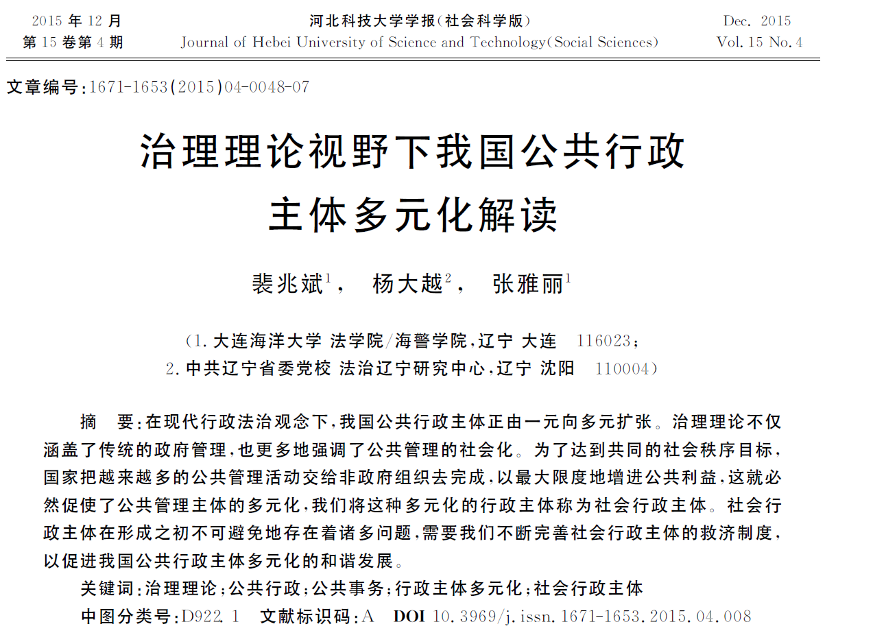 我院院长裴兆斌在河北科技大学学报(社会科学版)2015年12月刊发表学术文章,文章题为《治理理论视野下我国公共行政主体多元化解读》。河北科技大学学报(社会科学版)为全国优秀社科学报、河北省优秀社科学报、《CAJ-CD规范》执行优秀期刊、RCCSE中国核心学术期刊(扩展版)、《中国核心期刊(遴选)数据库》收录期刊。
