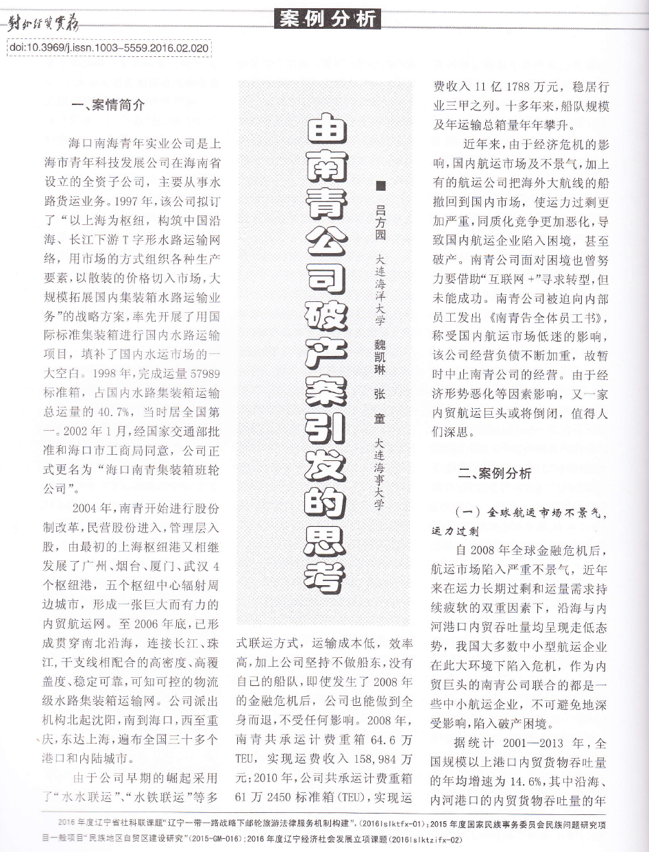 我院教师吕方园在北大中文核心期刊《对外经贸实务》(2016年2月)上发表题为《由南青公司破产案引发的思考》文章。《对外经贸实务》为全国中文类、贸易经济类核心期刊(第八版)来源期刊。
