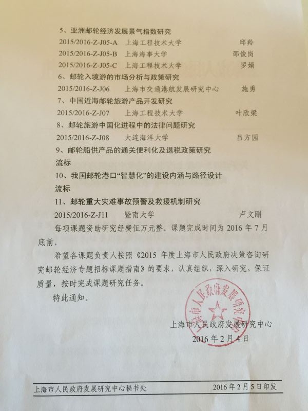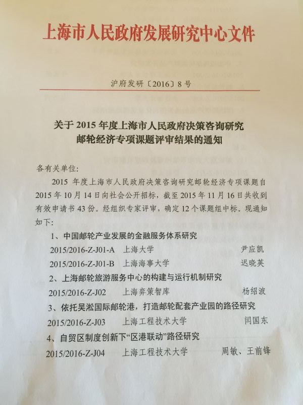 我院教师吕方园,裴兆斌,刘臣,范英梅,孙岑等老师联合申请了上海市政府咨询决策课题:邮轮旅游中国化进程中的法律问题研究,并获立项。立项编号2015/2016-Z-J08。课题资助经费5万元。