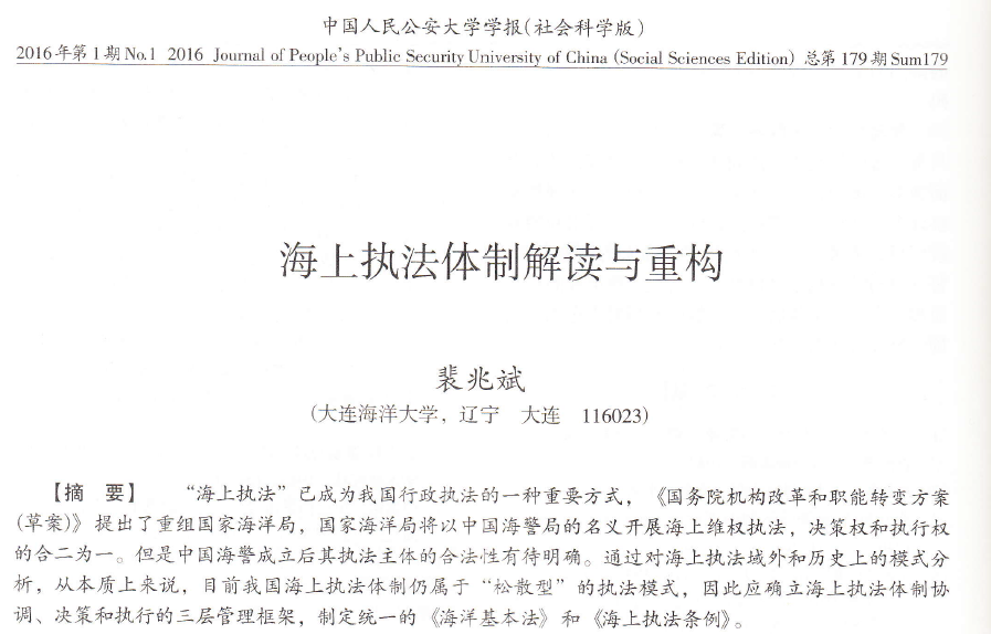 我院院长裴兆斌在中国人民公安大学学报(社会科学版)2016年第1期发表题名为《海上执法体制解读与重构》的文章。中国人民公安大学学报(社会科学版)是中华人民共和国公安部主管,中国人民公安大学主办的全国中文核心期刊。
