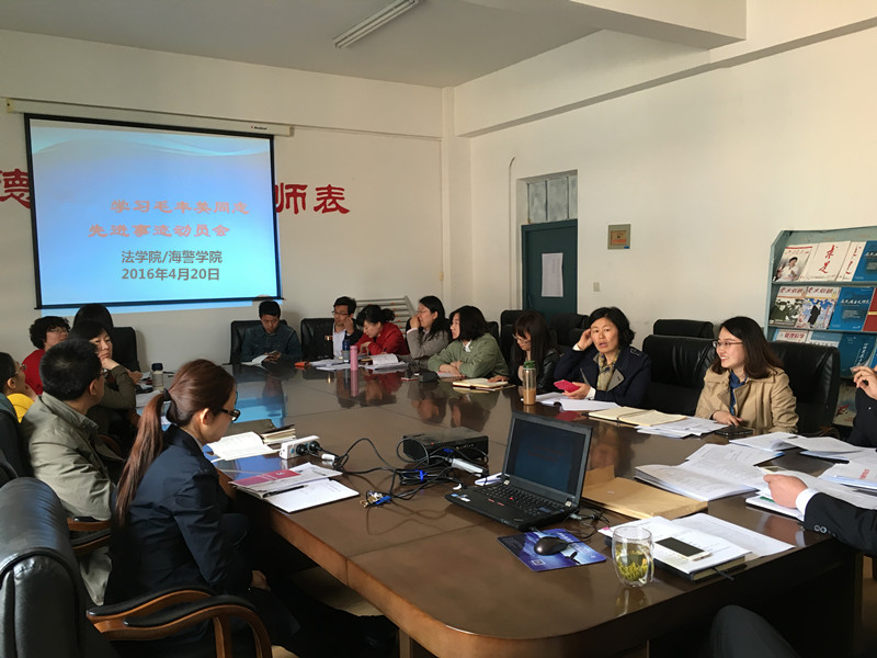 2016年 4月20日下午,法学院(海警学院)学习毛丰美同志先进事迹动员会在法学院6楼会议室举行。法学院院长裴兆斌,党总支书记刘海廷,副院长朱晖、滕鹏、戴瑛以及法学院全体教师参加了此次活动。毛丰美同志平凡质朴而又感人至深的先进事迹,为我院的党员干部上了一堂生动的党课,增强了党员们的党性观念,使党员们充分认识到严格修身律己的重要性,树立向毛丰美同志学习的思想和行动自觉,敢于担当,锐意进取。