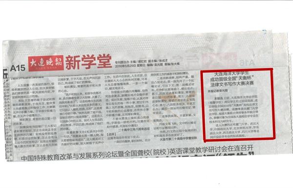 5月29日,《大连晚报》A15版以《tyc33455cc太阳成集团学生成功晋级全国“天衡杯”法律文书写作大赛决赛》为题报道了我校法学院(海警学院)成功晋级全国2016年“天衡杯”高校法律文书写作大赛决赛。国搜大连、东北网、中国高校之窗等网络媒体也相继转载该报道。