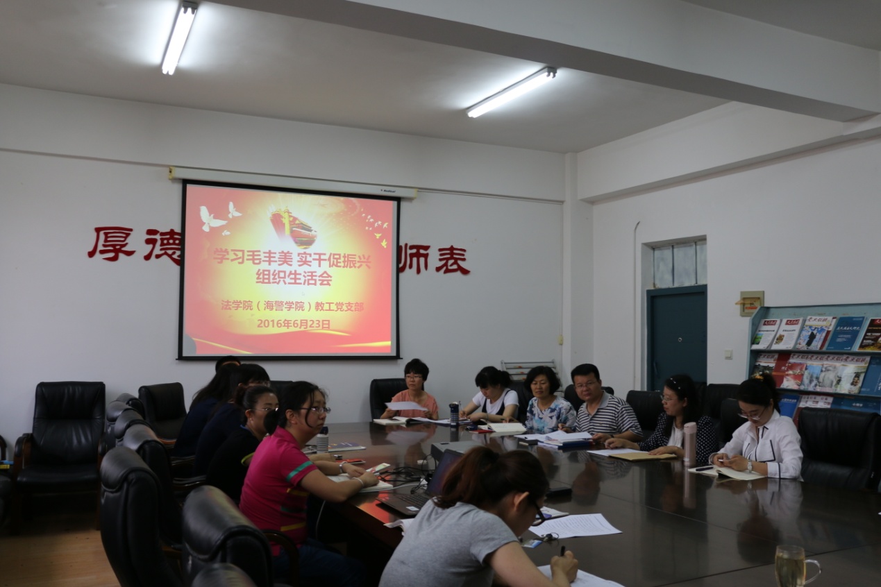 6月23日,法学院(海警学院)教工党支部在学院会议室组织开展“学习毛丰美,实干促振兴”组织生活会。支部委员及学院处级以上党员干部对照毛丰美同志的先进事迹,联系个人思想、工作、生活和作风实际,开展了批评和自我批评。