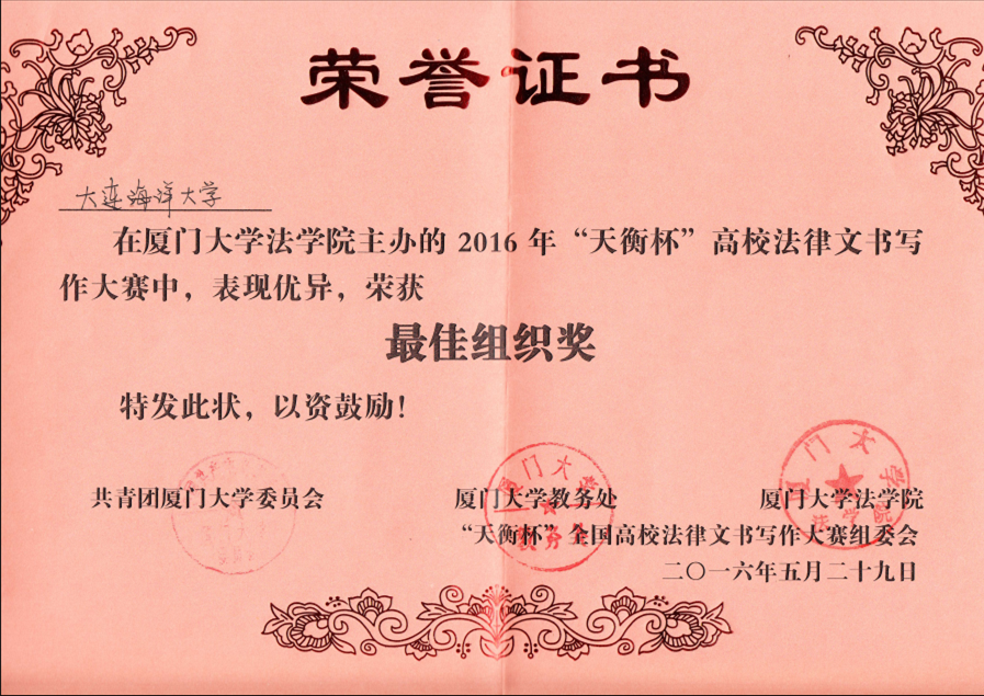 5月29日上午,2016年“天衡杯”全国高校法律文书写作大赛圆满落幕。tyc33455cc太阳成集团、华东政法大学,集美大学,四川大学在本届“天衡杯”高校法律文书写作大赛决赛中分别荣获“最佳组织奖”。我校法学院(海警学院)2014级法学本科学生陈兰和2015级法律硕士王子欣在决赛中分别获得本科生决赛组“优秀奖”、研究生决赛组“优秀奖”,各获奖金500元。本次决赛共有来自全国各地25名本科生选手和25名研究生选手参加,均来自厦门大学、武汉大学、中国政法大学、北京师范大学、华东政法大学、西北政法大学、四川大学等全国开设法学专业的知名高校。