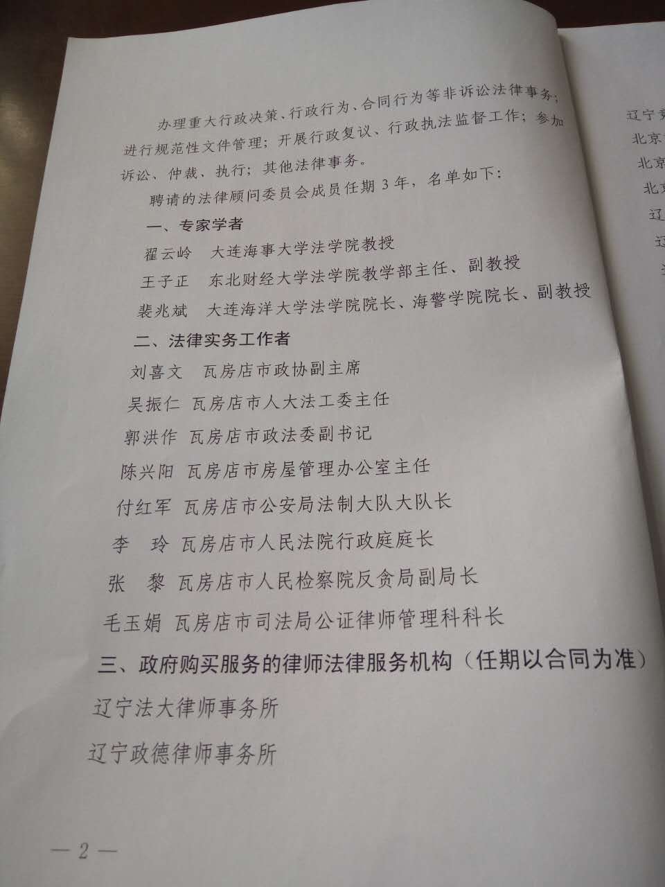 为贯彻党的十八届四中全会关于推动政府法律顾问制度的要求,提高依法行政水平,加快推进法治政府建设,日前,瓦房店市政府设立法律顾问委员会。我院院长裴兆斌被聘为瓦房店市人民政府法律顾问委员会专家学者,聘期三年。