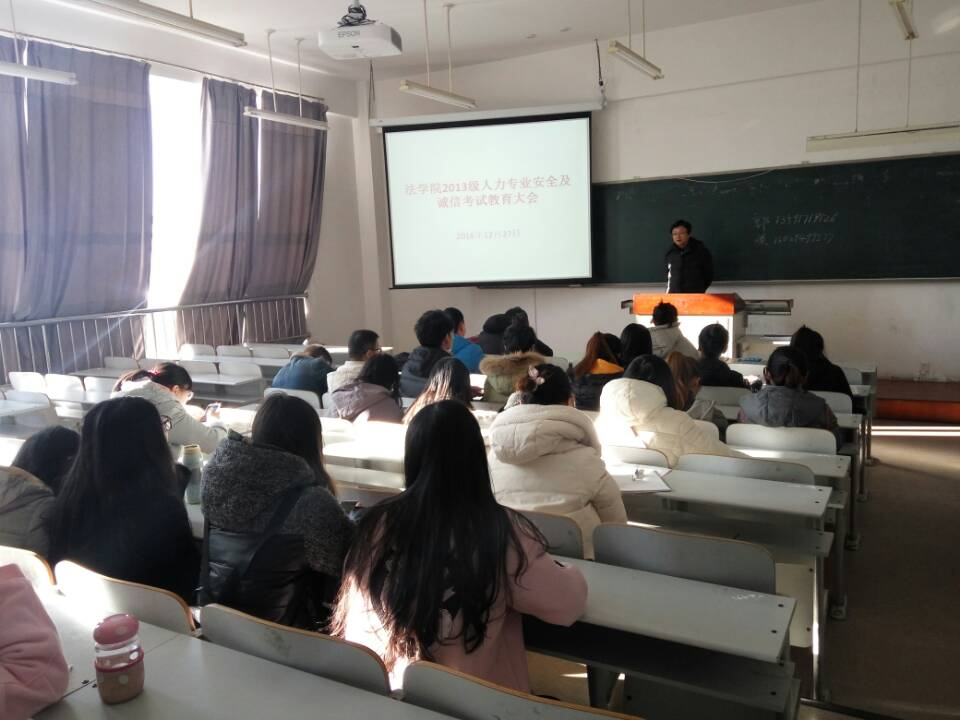2016年12月26日,法学院(海警学院)2013级人力资源管理专业在獐子岛教学楼103教室召开了安全及诚信考试教育大会。会议由副院长滕鹏主持。他主要就以下几个方面内容进行了重点阐述。