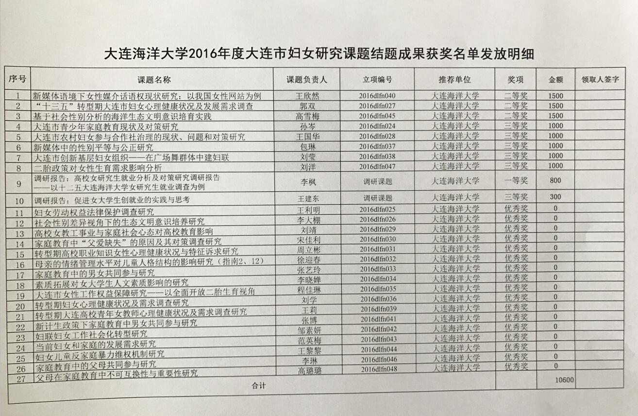 据悉,2016年度大连市共有62项妇联课题顺利结项,23篇调研报告获奖,我校获奖项目数及报告质量再创新高。