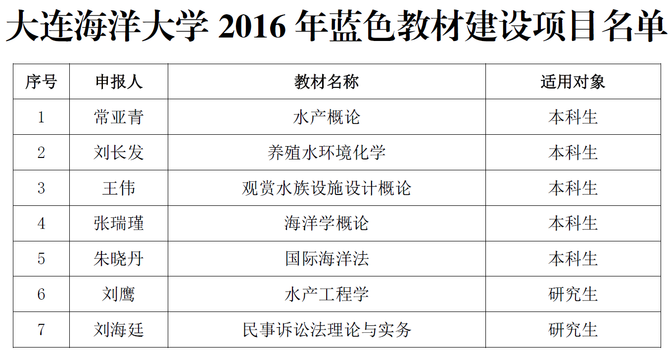 日前,学校启动了2016年蓝色教材建设项目申报工作。经各学院推荐、学校组织校内外专家评审,确定《水产概论》《养殖水环境化学》等5部本科生教材、《水产工程学》《民事诉讼法理论与实务》2部研究生教材为我校2016年蓝色教材建设项目。学校将根据教材编写实际情况,对每个项目给予2-3万元的经费支持。其中,我院朱晓丹副教授主持申报的《国际海洋法》和刘海廷教授主持申报的《民事诉讼法理论与实务》分别获批本科生和研究生教材立项。