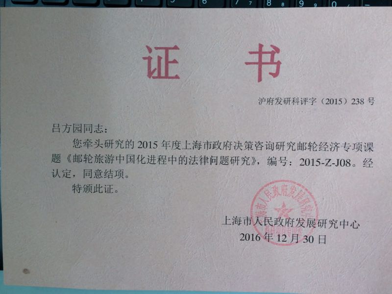 【校园喜报】我院教师吕方园牵头研究的2015年度上海市政府决策咨询研究邮轮经济专项课题顺利结项