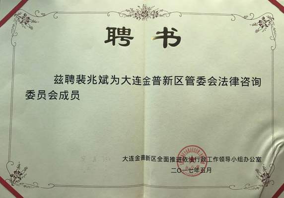 为加强法制工作,促进依法行政,进一步提高依法决策水平,近日,大连金普新区全面推进依法行政工作领导小组办公室发布文件,聘请法学院(海警学院)院长裴兆斌为大连金普新区管委会法律咨询委员会成员,为金普新区建设过程中所涉有关法律问题提供法律咨询意见。