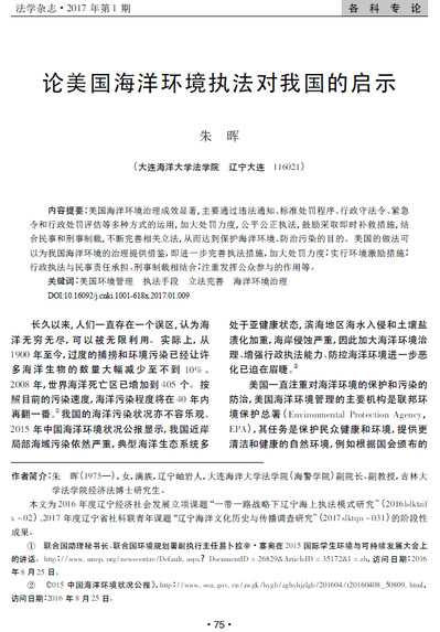 法学院(海警学院)朱晖副院长、副教授以第一作者在《法学杂志》2017年第1期发表题为“论美国海洋环境执法对我国的启示”的文章。文章分析了美国海洋环境管理的行政执法措施和非强制措施。