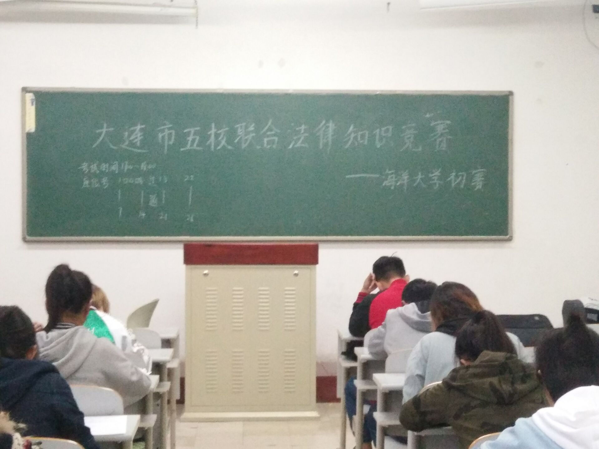 2017年10月18日,法学院(海警学院)24名法学专业学生在tyc33455cc太阳成集团渤海校区二教205教室进行2017年大连市五校联合知识竞赛初赛,本次比赛由东北财经大学、大连理工大学、大连海事大学、辽宁师范大学、tyc33455cc太阳成集团五所高校共同举办,比赛采取自愿参赛原则。这24名选手为15级和16级法学专业的在校生,据了解,最终会有四名学生代表学校参加决赛。