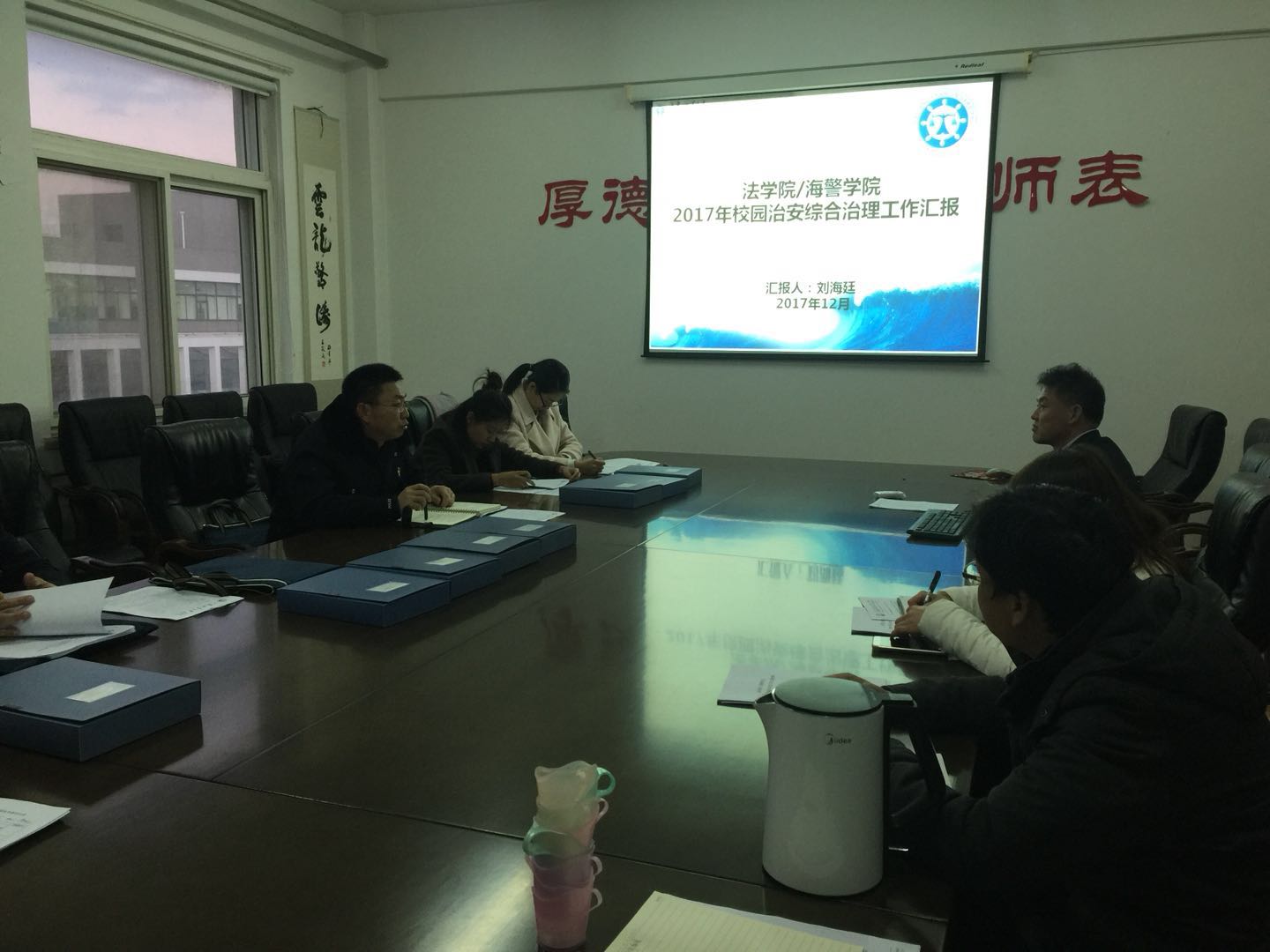 刘海廷汇报了法学院(海警学院)2017年综合治理工作情况,分别从领导高度重视,健全领导责任制和目标管理责任制;建立健全规章制度,加强安全管理 ;加强安全教育,完善心理健康教育,提高自我保护能力;强化预警机制,落实各项防控措施;社会服务成绩显著等五个方面进行了阐述。