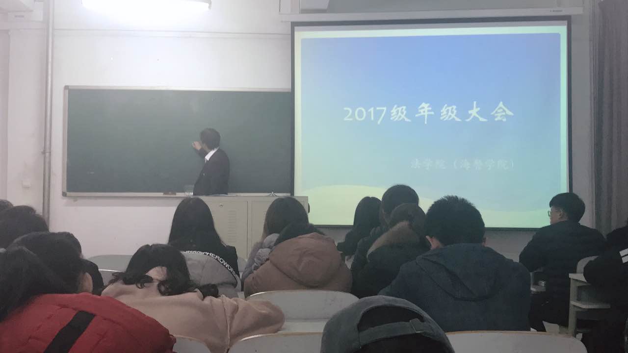 为了使2017级的同学们能够更好地总结本学期的学习和生活状况,以及学会对未来工作与学习做好自身规划,法学院(海警学院)于2017年12月26日13:30在二教302召开了2017级年级大会。本次会议由法学院(海警学院)副院长滕鹏主持,法学院(海警学院)2017级全体同学参加。