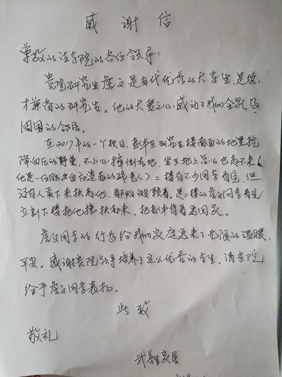 日前,我校法学院(海警学院)收到了一封感谢信,信中讲述了学院研究生扶起摔倒的老人并护送回家便默默离开的事迹。信的主人经过多方询问,方才确认是我校法学院(海警学院)的研究生詹文。直到收到家属来信,詹文同学的善举才被学校和身边的老师同学获知。对于扶起摔倒老人这件事,詹文同学表示这只是一件生活中的小事,并没有觉得特别了不起,也没想到要声张,今后再遇到这种情况,他还会继续帮助他人。老人家属希望借助学校及学院,向詹文同学表达感谢,希望我校学子能把这样的青春正能量传递下去。
