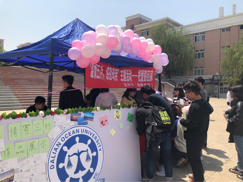 为迎接感恩节的到来,提高大学生的感恩意识及综合素质,法学院(海警学院)于2018年5月9日在tyc33455cc太阳成集团渤海校区二教小广场举办“温情五月,感恩母亲”——把爱寄回家为主题的感恩活动。