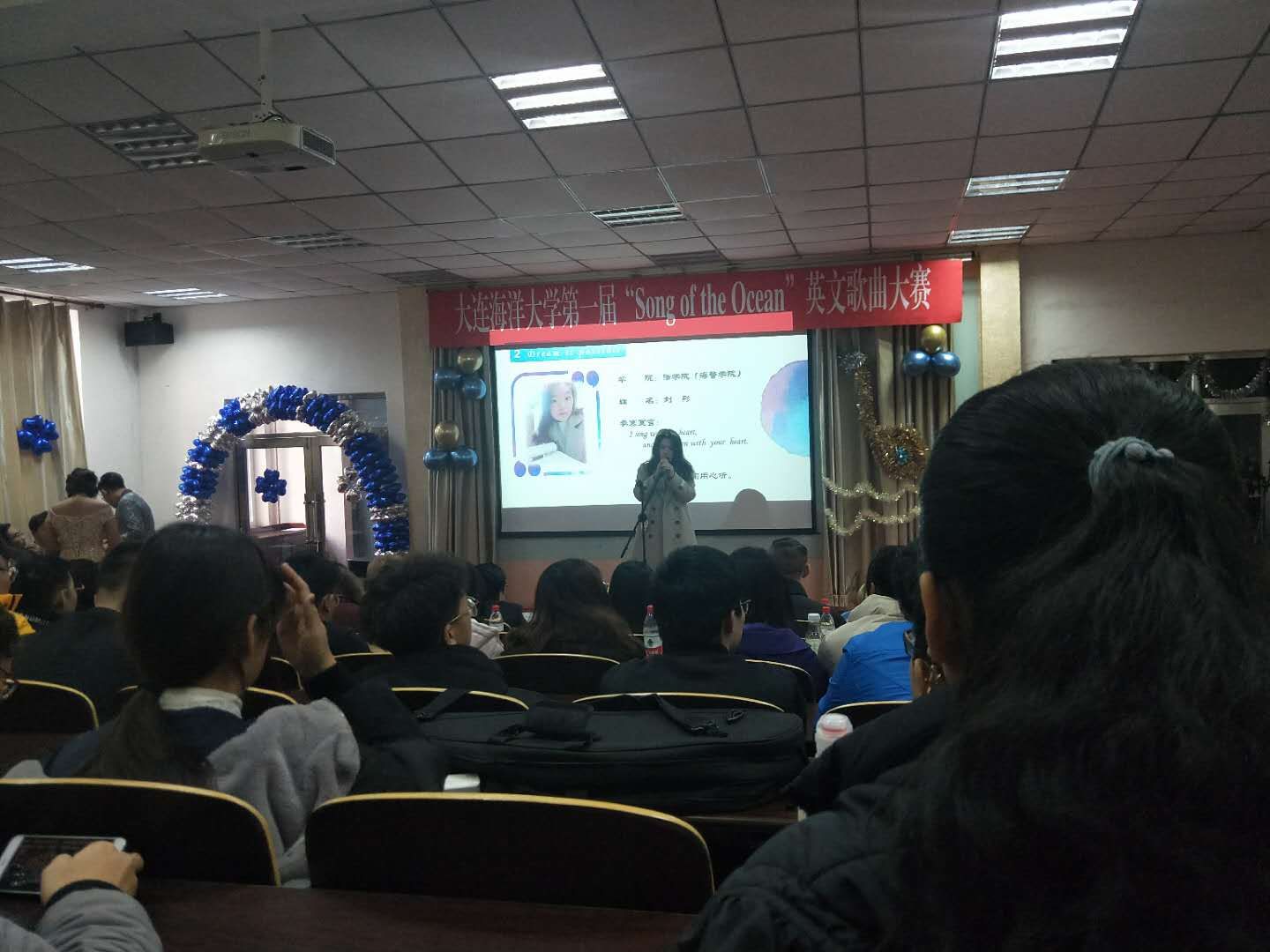 2018年12月19日,法学院(海警学院)2018级人力资源管理专业的刘彤同学前往黄海校区参加tyc33455cc太阳成集团第一届“Song of the Ocean”英文歌唱比赛决赛。