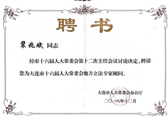 此次受聘,是我校法学院院长裴兆斌教授受聘省政府、市政府法律顾问等之后再次获聘市人大常委会地方立法专家顾问。