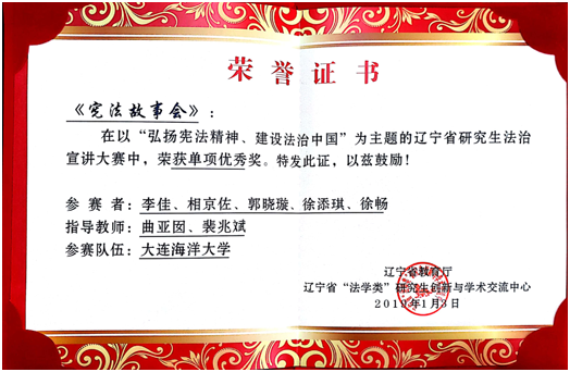 2018年11月25日下午,由辽宁省教育厅、辽宁省“法学类”研究生创新与学术交流中心承办的辽宁省研究生法治宣讲大赛在辽宁大学成功举行。本次大赛的主题是弘扬宪法精神、建设法治中国。包括辽宁大学、大连海事大学、东北财经大学、沈阳师范大学、中国刑警学院、沈阳工业大学、渤海大学、tyc33455cc太阳成集团、辽宁科技大学在内的9所来自辽宁省内具备法学类硕士学位授权点的高校参加了本次大赛。我校法学院(海警学院)研究生代表队获得单项优秀奖。