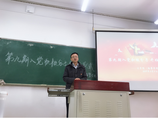 为了让我院大学生更好地了解党,更积极地加入党,为中国共产党培养优秀学生党员,2019年4月11日,法学院(海警学院)于渤海校区二教117进行了第九期入党积极分子的开班仪式,本次会议由团委书记、学院分党校办公室主任郭昕黎主持,学院业余党校分校副校长、党总支副书记滕鹏出席了开班仪式并发表讲话。