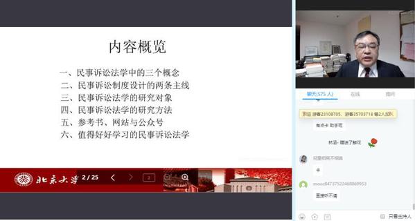 为了丰富法学专业同学的专业知识,推进线上学习和交流。学校充分利用在家网上学习的时间开展了法学名师大讲堂。2020年4月24日19:00-20:00,“云端”名师大讲堂第七讲开播。法学教研室会同法硕中心组织法学专业本科生和法律硕士研究生在线收看了中国大学MOOC开放的学术讲座 “三言两语话民诉:民诉法学学习入门纲要”,由北京大学法学院教授潘剑锋主讲。