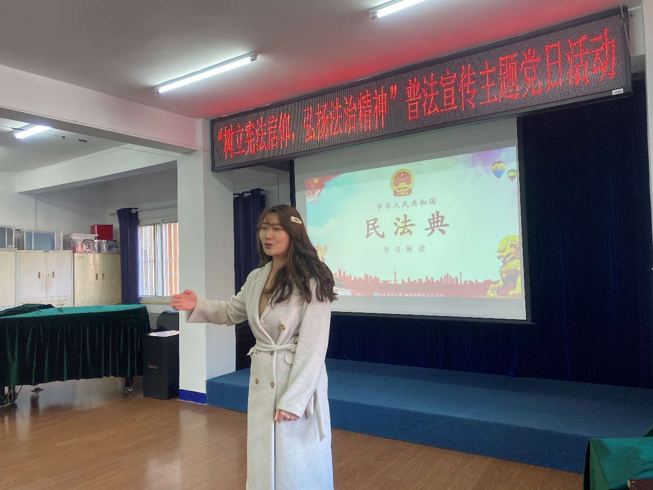 2020级研究生赵海毅为到场老师讲解了新修订的民法典相关知识。结合本次普法活动的对象都是有一定工作经历和生活经历的老教师,赵海毅重点讲解了关居住权、离婚冷静期等民法知识。会后,2019级法律硕士张明珠、谢冰玉同学针对老师们的问题,如:遗嘱继承和生前赠与有什么不同的问题,离婚后财产分配问题,事实婚姻是否存续等问题,为老教师们进行了简单的解答和探讨,参会的同学们也通过这样的讨论学习到了书本上学习不到的知识。