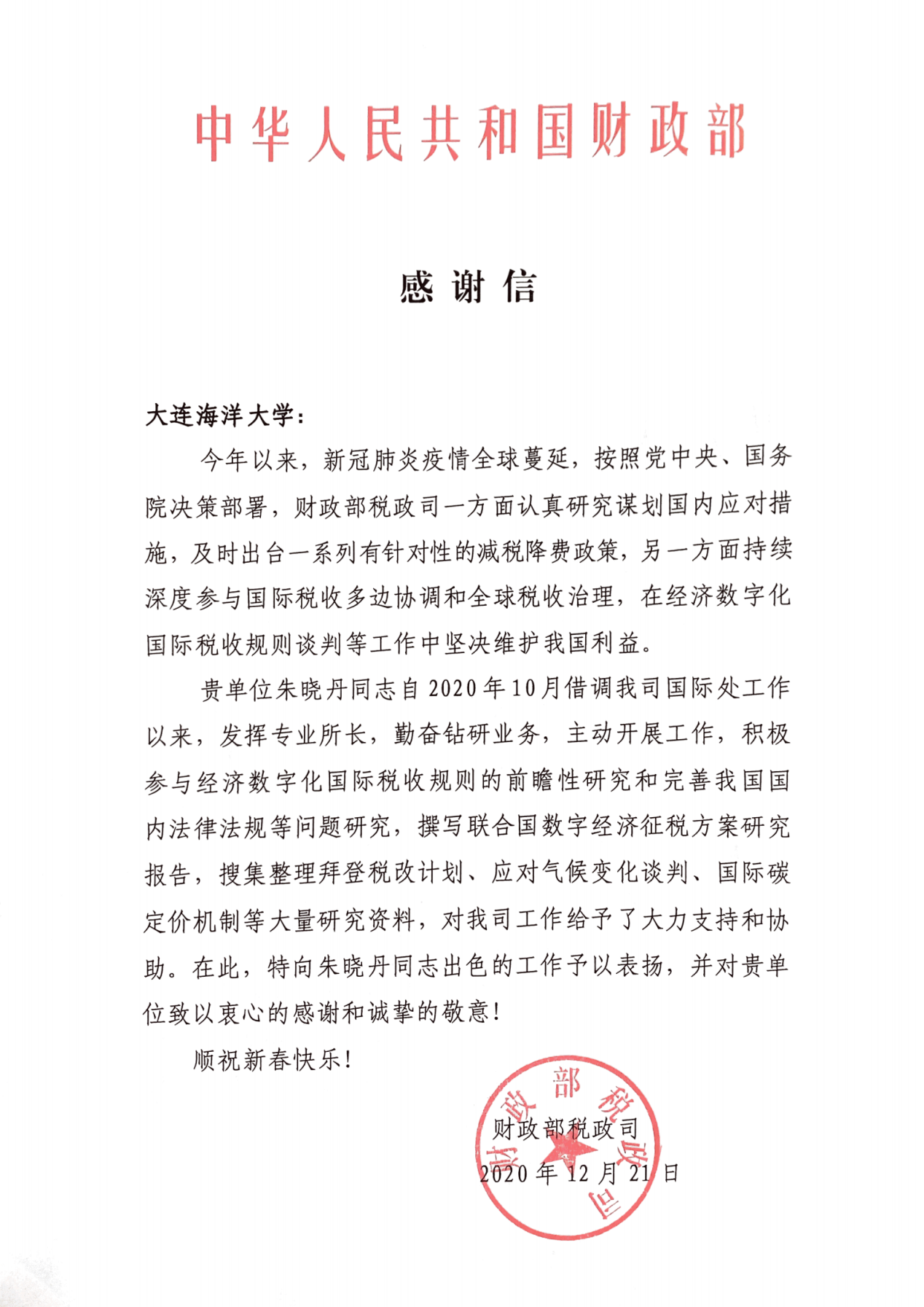 近日,财政部税政司向我校发来感谢信,对我校太阳成集团tyc33455ccww教师朱晓丹在借调税政司国际处以来的工作表示感谢。感谢信指出,朱晓丹同志自2020年10月借调财税司工作以来,发挥专业所长,勤奋钻研业务,主动开展工作,积极参与经济数字化国际税收规则的前瞻性研究和完善我国国内法律法规等问题研究,撰写联合国数字经济征税方案研究报告,搜集整理拜登税改计划、应对气候变化谈判、国际碳定价机制等大量研究资料,对税政司工作给予了大力支持和协助。财税司向朱晓丹同志出色的工作予以表扬,并对我校致以衷心的感谢和诚挚的谢意。