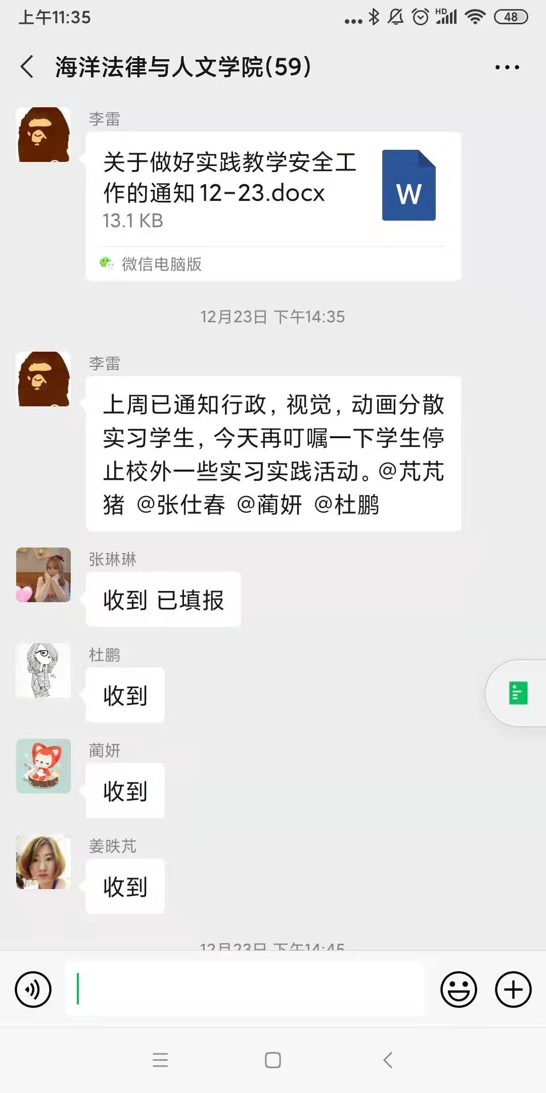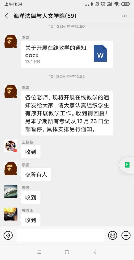 图 教学院长李雷在学院教师群中发布线上教学相关通知