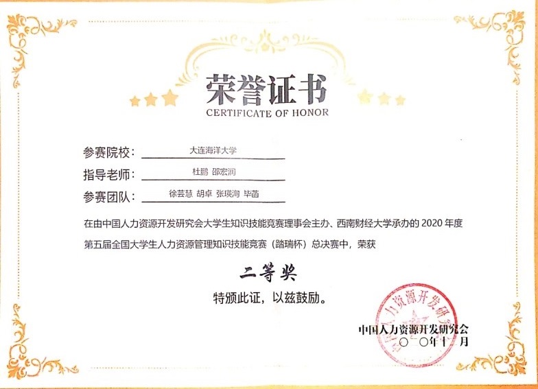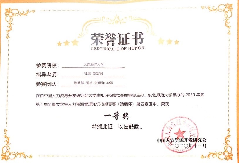 太阳成集团tyc33455ccww人力资源管理专业2018级学生徐芸慧、胡卓、毕菡、张瑛洵在杜鹏老师和邵宏润老师共同带领下取得了优异成绩,先后在区域赛第四(东北)赛区夺得“一等奖”、全国总决赛夺得“二等奖”。
