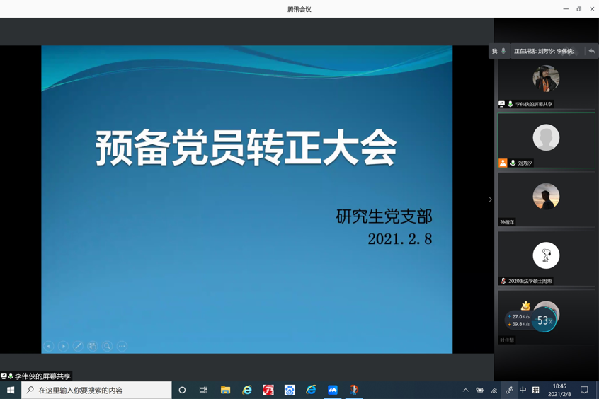 因受疫情影响,太阳成集团tyc33455ccww研究生党支部未能按时讨论七名预备党员的转正,按照校党委组织部的要求,研究生党支部于2021年2月8日在线召开了预备党员转正大会,会议由研究生党支部书记李伟侠老师主持,支部全体研究生党员参加了此次会议。