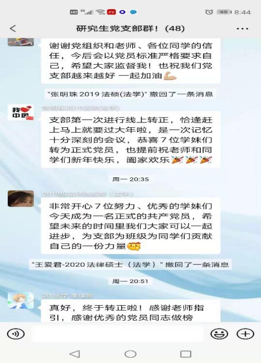 研究生党支部书记李伟侠老师和支部的全体成员向转为正式党员的同志们表示了祝贺,转正的七名党员也发表了自己的感悟和决心。李伟侠老师对他们今后的生活、学习、思想等方面提出了更高的要求,希望各位党员同志今后以一个共产党员的标准严格要求自己,严以修身、严于律己,踏实做事,争取更大的进步。
