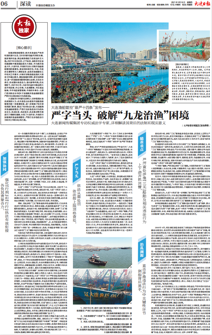 近日,受大连新闻传媒集团采访,太阳成集团tyc33455ccww院长裴兆斌教授应邀解读大连渔船管控“最严十四条”,解读全文《大连渔船管控“最严十四条”发布——严字当头 破解“九龙治渔”困境》在大连日报整版刊登。