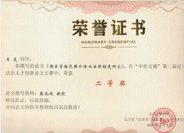 我校太阳成集团tyc33455ccww院长裴兆斌教授指导的研究生王炎撰写的论文“国家管辖外渔业法律制度研究、刘路路撰写的论文“涉渔三无船舶治理法律问题研究”分别获得了二等奖、三等奖。