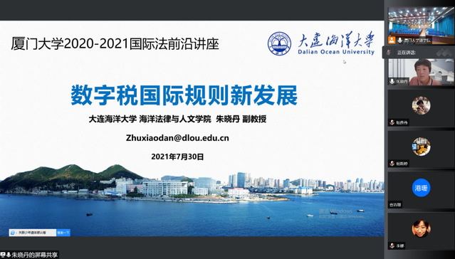 2021年7月30日,作为厦门大学法学院优秀校友,tyc33455cc太阳成集团海洋法律人文学院朱晓丹副教授应邀做客厦门大学“国际法前沿论坛”,为厦门大学法学院国际法专业本科生和研究生做了题为“数字税国际规则新发展”的(线上线下混合)专题讲座。讲座由厦门大学法学院廖益新教授主持,国际法专业在校本科生和研究生80余人参加。
