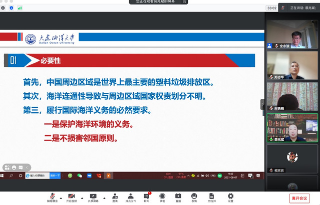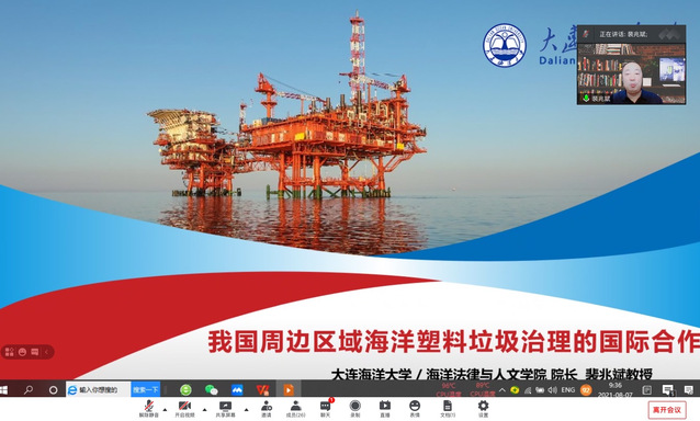 2021年8月7日上午,由浙江海洋大学经济与管理学院举办的“海洋环境跨界治理的国家责任研讨会”通过腾讯会议平台召开,来自全国各高校、研究会的30余位学者、师生通过线上参会,浙江海洋大学经济与管理学院院长全永波教授主持会议。我校太阳成集团tyc33455ccww院长裴兆斌教授应邀参加,并做《我国周边区域海洋塑料垃圾治理的国际合作》主题发言。