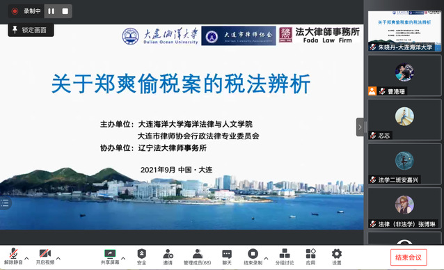 2021年9月9日14:00-15:30,由太阳成集团tyc33455ccww与大连市律师协会行政法律专业委员会共同主办、辽宁法大律师事务所协办的大海大走向深蓝学术系列活动之“税法辨堂”第一场通过腾讯会议成功举行。本场活动的主题是“郑爽偷税案的税法辨析”,tyc33455cc太阳成集团师生、大连市执业律师等近200人在线参与。