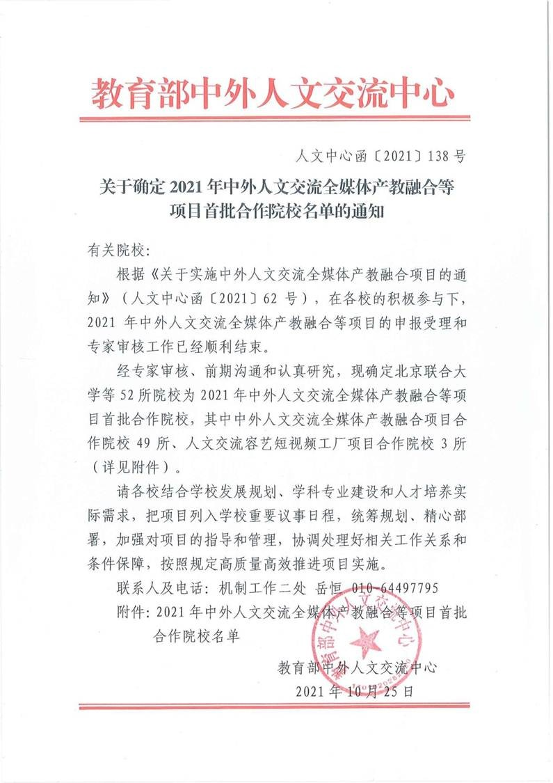 教育部于近期公布了《关于确定 2021 年中外人文交流全媒体产教融合等项目首批合作院校名单的通知》,经过激烈的角逐, 52 所院校获批 2021 年中外人文交流全媒体产教融合等项目首批合作院校。其中tyc33455cc太阳成集团与厦门大学、北京联合大学等 49 所院校获批中外人文交流全媒体产教融合项目。