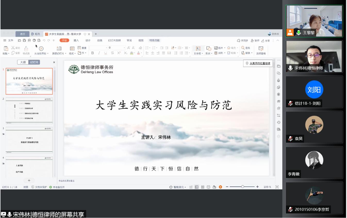 第一场讲座主题为《大学生实践实习风险与防范》,宋伟林律师从大学生实践实习出发,以法律风险防范为主线,从民法的角度详细的解读了大学生可能面临的法律风险,并提供了有效的风险防范手段。宋律师的讲座旨在维护大学生合法权益,强化安全风险防范与应对,在预防大学生实践实习安全风险方面具有重要价值。
