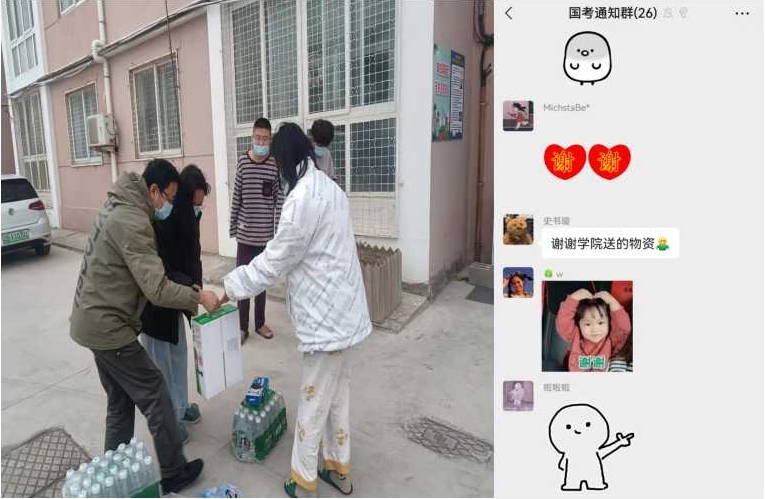 此外,学院还建立了“国考通知群”,把“暖心服务”融入“硬核管理”,使学生安心,家长放心。同时,学院还为隔离同学加送了饼干、牛奶、面包等生活物资,让同学们感受到学院的关爱。