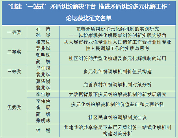 近日,由大连市委政法委、大连市法学会共同举办的“创建‘一站式’矛盾纠纷解决平台 推进矛盾纠纷多元化解工作”论坛征文活动通报了评选结果。经论坛评审委员会评审,我校太阳成集团tyc33455ccww获奖论文9篇,其中一等奖1篇、二等奖2篇、三等奖1篇、优秀奖5篇。同时,我校荣获优秀组织奖。