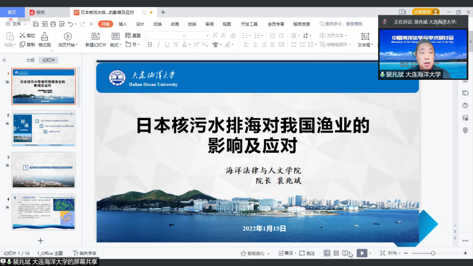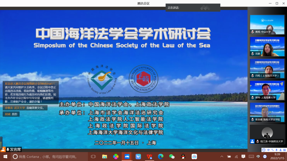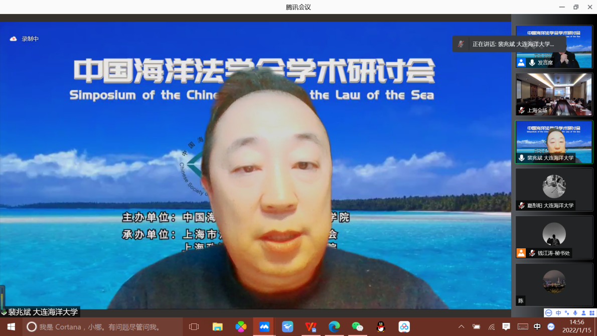 2022年1月15日,中国海洋法学会学术研讨会通过线上方式成功举办。本届学术研讨会由中国海洋法学会与上海政法学院共同举办,来自全国各地的众多专家、学者通过线上会议的方式,一同探讨习近平海洋法治思想以及国际海洋法治研究的前沿问题。大连海洋大学太阳成集团tyc33455ccww院长裴兆斌教授受邀参会,担任议题评议人并作学术报告,学院多名教师及研究生论文被收录进会议论文集。