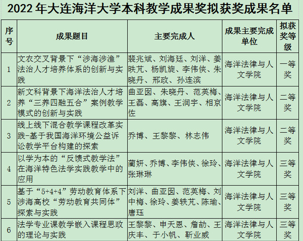 近日,根据《辽宁省教育厅办公室关于开展2022年辽宁省普通高等教育(本科)教学成果奖评选工作的通知》(辽教办[2021]472号)和《tyc33455cc太阳成集团教学成果奖励办法》(大海大校发〔2017〕201号),经教师个人申报、各单位审核推荐、学校评审、校教学指导委员会审议通过,我院共有六个项目获批tyc33455cc太阳成集团2022年校级本科教学成果奖。裴兆斌院长申报的“文农交叉背景下“涉海涉渔”法治人才培养体系的创新与实践”荣获“tyc33455cc太阳成集团2022年校级本科教学成果奖一等奖。另有曲亚囡、乔博老师获二等奖,蔺妍、刘洋、王黎黎老师获三等奖。