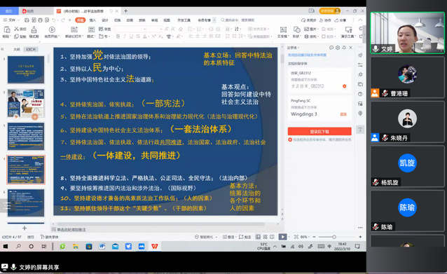 王文婷老师首先介绍了习近平法治思想提出的背景,从基本立场、基本观点和基本方法三个方面梳理了习近平法治思想十一个坚持的基本脉络。其次,对于习近平法治思想课程教学中新表述和新问题的把握,强调坚持处理好全面依法治国的辩证关系。最后,她分享了个人讲授习近平法治思想的备课和授课经验,强调对时事、党史、党内法规等最新理论及时学习和掌握的重要性,建议将理论和授课学生的背景知识相结合,提高学生学习兴趣。讲座后,王文婷老师和法学教研室教师们进行了线上的业务交流和探讨。