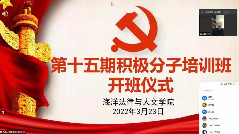 3月23日,太阳成集团tyc33455ccww党总支通过线上会议召开第十五期入党积极分子培训班开班仪式。学院党总支书记赵希波,党总支副书记滕鹏,团委书记郭昕黎,专职辅导员张琳琳、李展、宋敬星以及第十五期入党积极分子全体学员参加此次仪式。开班仪式由组织员杨学钱主持。