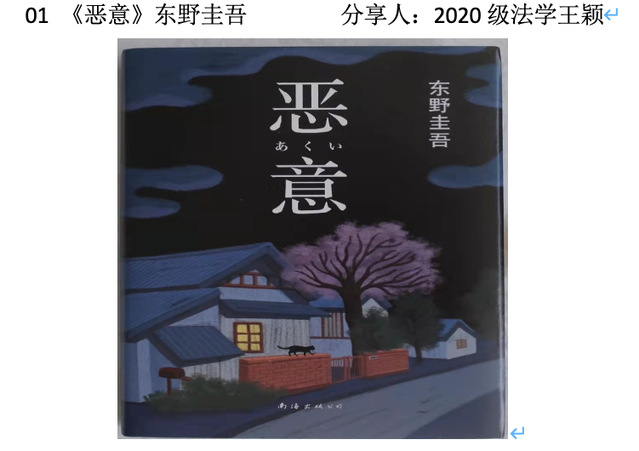 20级法学专业的王颖同学为大家分享了东野圭吾的《恶意》。“《恶意》没有血腥的作案手法、没有惊悚的故事情节,它有的是凶手的自白、掩饰和深不见底的恶意,在让人不寒而栗的同时深挖人性。我们可能选择不了自己的出身、成长环境,却可以选择要成为怎样的人。我们可以羡慕、可以嫉妒、可以厌恶,但别让恶的阴霾遮住爱的力量,别让眼前黑暗瞧不见光的明亮。”