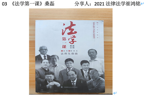 21级法律(法学)的崔鸿铭同学分享了桑磊的《法学第一课》。“本书对于法本学生可以更好地理解一名法科生成长所需要具备的各种‘软实力’;对于非法本学生可以更加透彻地理解如何学习法学以及如何学好法学。同时,书中各位法学名家所讲述的青春岁月往事,也让人感慨时光易逝,勇争朝夕。”