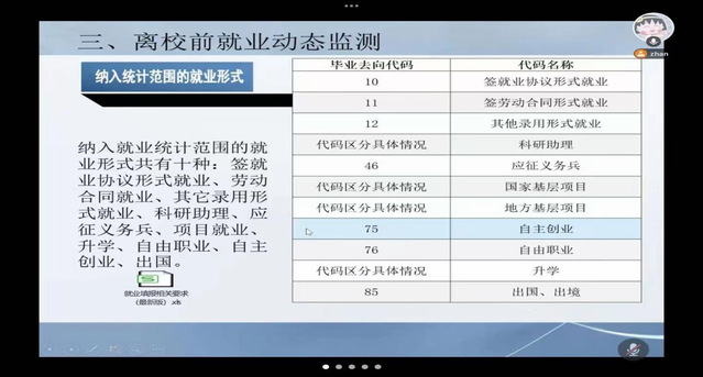 会上李展老师就当前就业形势和我校就业趋势进行了介绍,并对下一步就业工作的安排做了简要说明。同时,李展老师还为毕业生详细介绍了就业形式、就业数据的采集方式以及就业系统的填报方法。